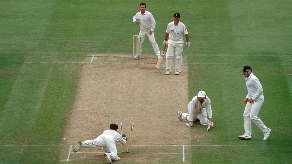 Nasser Hussain was involved in a fair few farcical run outs during his career but surely none were as comical as the run out of Sanath Jayasuriya at Adelaide in 2003. Chasing England’s 279-6, the Sri Lankan left-hander had advanced to 99 in just the 28th over when disaster struck. Having driven to Hussain at mid-off for a comfortable single, Jayasuriya and partner Kumar Sangakkara gravely took the same route down the pitch, running wider and wider and wider still, magnetically pulled into a collision at short mid-wicket. Despite completing about 24 yards with the angle, the opener was still about three yards short when Nasser’s throw hit the stumps.