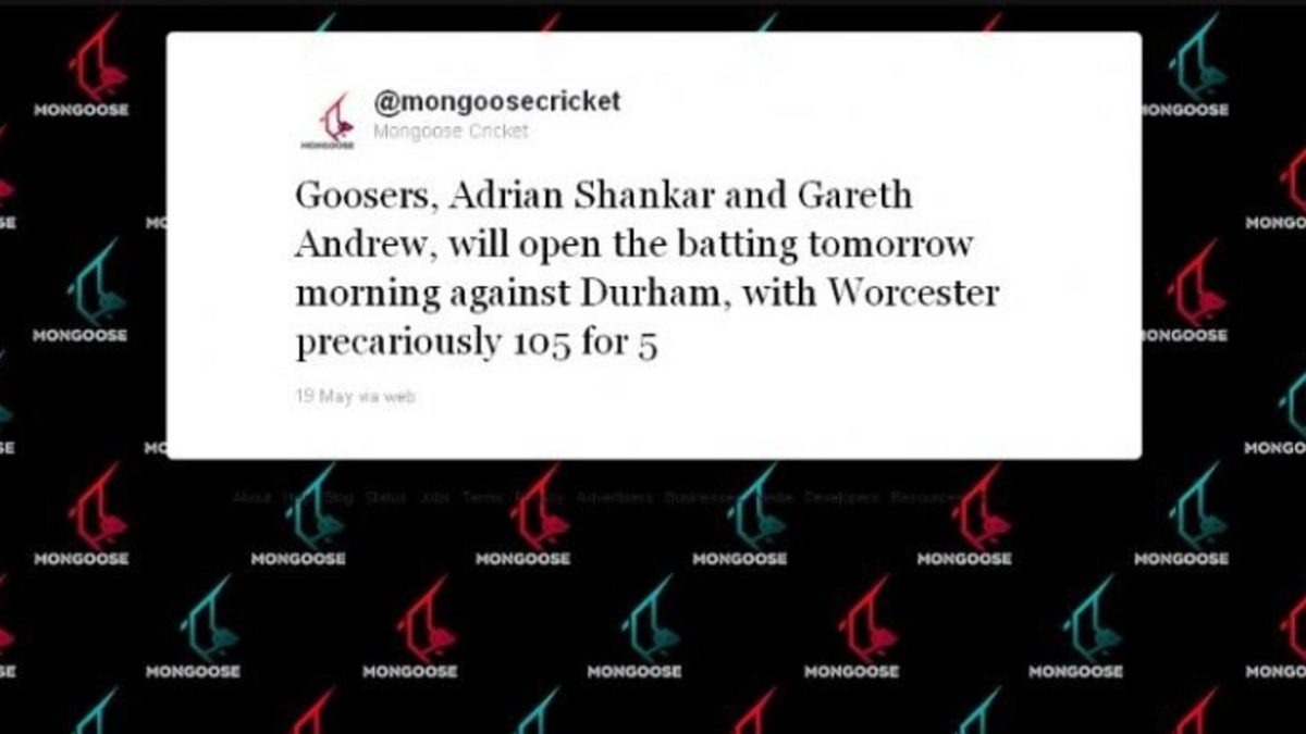 Nevertheless, on May 19, 2011 the company’s life-support machine – which did not suspend the company’s age – was not yet flatlining, and early in Shankar’s maiden Championship innings they tweeted: “Fingers crossed for Adrian Shankar, making his first class debut for Worcester on 3 not out. He’s a rare mix of elegance and ferocity.” Later that day, after Shankar had scrapped through to 10 not out at the close, they followed up with: “Goosers, Adrian Shankar and Gareth Andrew, will open the batting tomorrow morning against Durham, with Worcester precariously 105 for 5.”