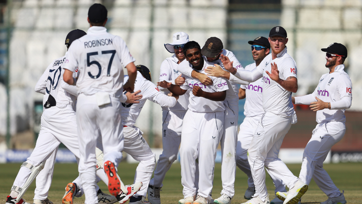 The 18-year-old leg spinner came away with figures of 2-89 from his debut innings after England lost the toss and fielded in Karachi. After bowling an initial wicketless spell before lunch, Rehan claimed Saud Shakeel as his first victim, bowling him a sharply spinning googly before catching his inside edge with a leg spinner, Ollie Pope taking a superb diving catch at short leg. He followed up by dismissing Faheem Ashraf LBW, a googly straightening from round the wicket and hitting him plumb on the back leg.