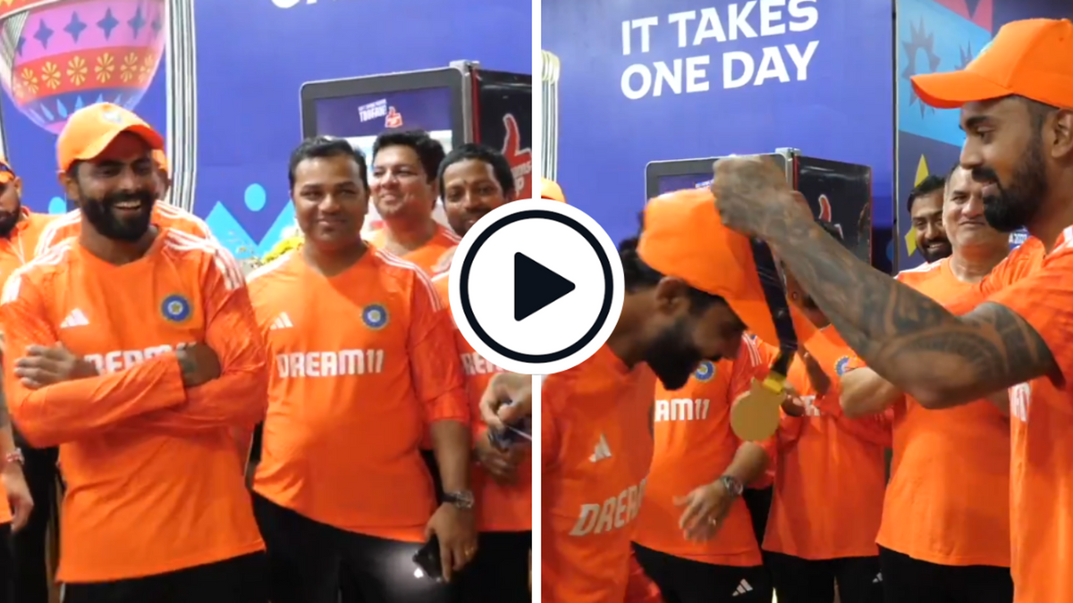 Watch: All-rounder Ravindra Jadeja grabbed the best fielder medal in India’s post-match dressing-room prize distribution ceremony following the victory against Bangladesh in the World Cup 2023 on October 19.