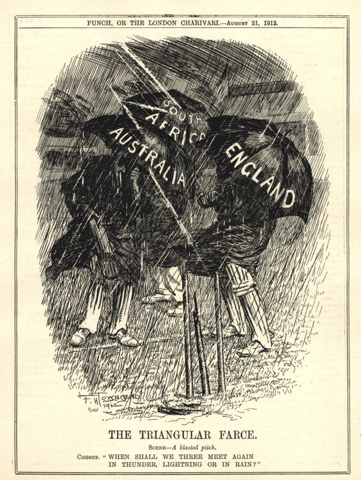 The Punch concluded the affair with a cartoon of three umbrella-covered cricketers (one for each team) amidst the downpour. ‘The Triangular Farce’ ran the caption, with the words “When shall we there meet again/In thunder, lightning or in rain?” underneath.
