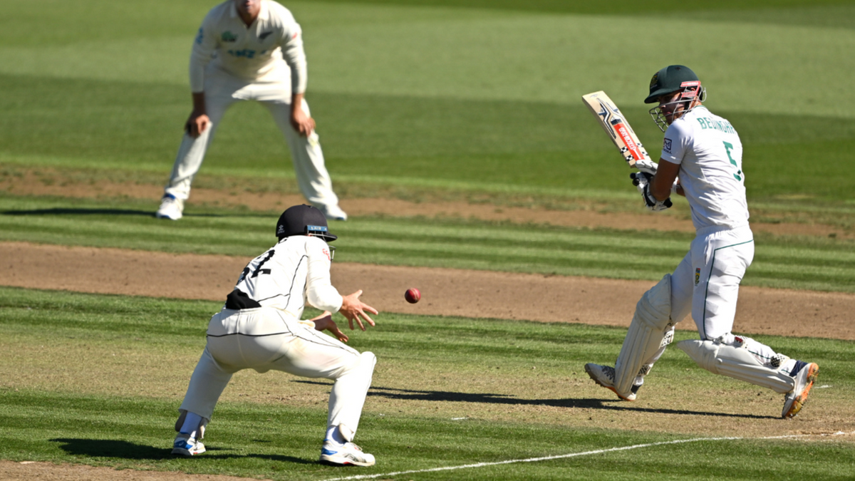 South Africa lost only one wicket in the final session of the day: that of Bedingham, and given the nature of his wicket, there will be frustration at what might have been had he survived. The No.5, who had battled to 39 off 102 balls, attempted to flick away Rachin Ravindra, but short leg intercepted the ball and threw at the stumps. New Zealand appealed half-heartedly, with the decision reviewed by the on-field umpires.
