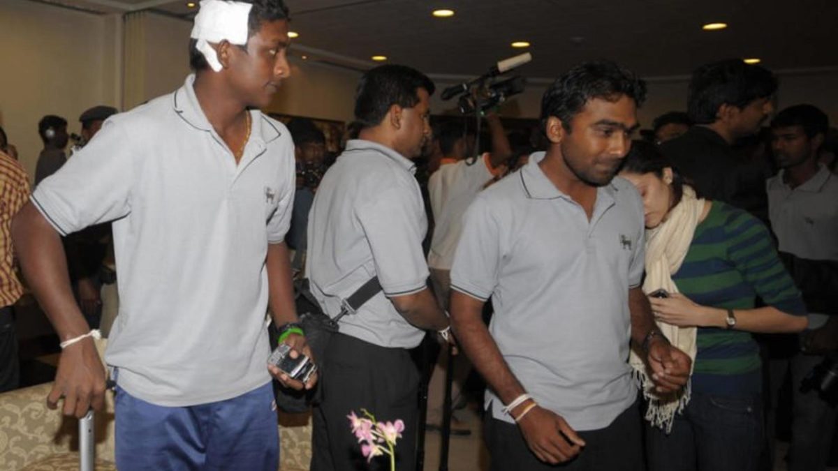 Samaraweera realised he could not stand up, and sought the help of Chamara Kapugedera, who lifted him from the bus to the dressing-room, where the players pulled the door shut behind them. They could still hear gunshots in the distance – the Sri Lankan team were now safe, or at least safer, but the minivan holding the umpires and match officials remained stranded at the Liberty Roundabout.